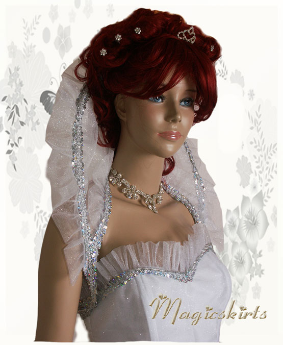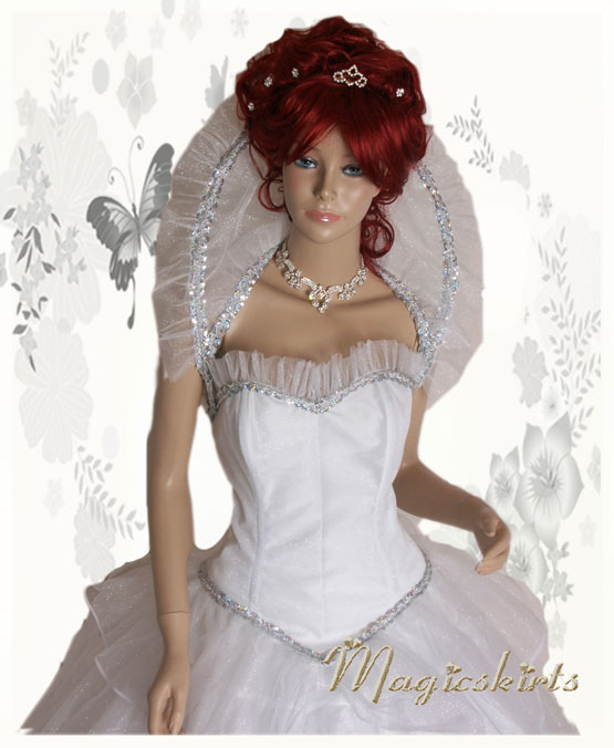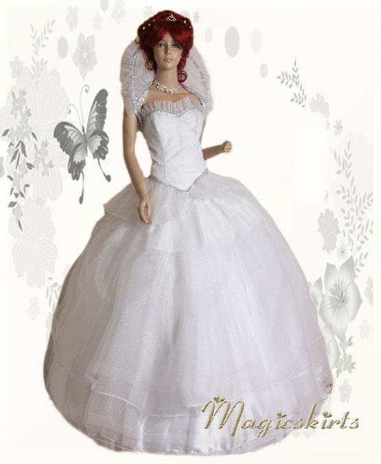 "Schneekönigin" auch als Brautkleid glitzernd und schimmernd 6 teilig: Oberteil mit Schößchen, Stehkragen, Halskette, Reifrock weiß, Ballrock weiß und 4lagig schimmernd weißer Rock jedes Teil kann auch separat getragen werden