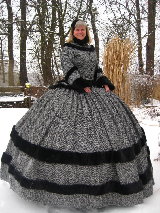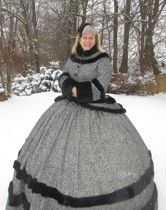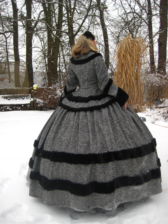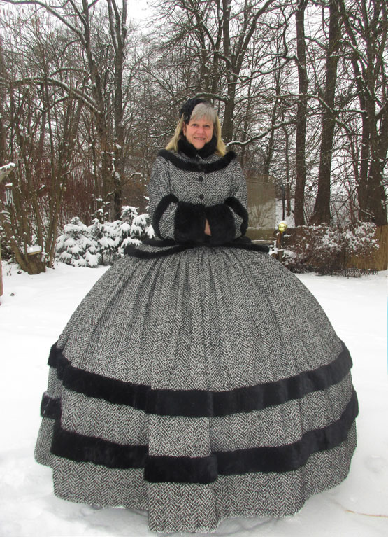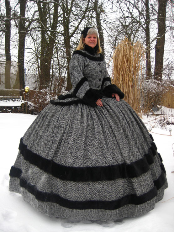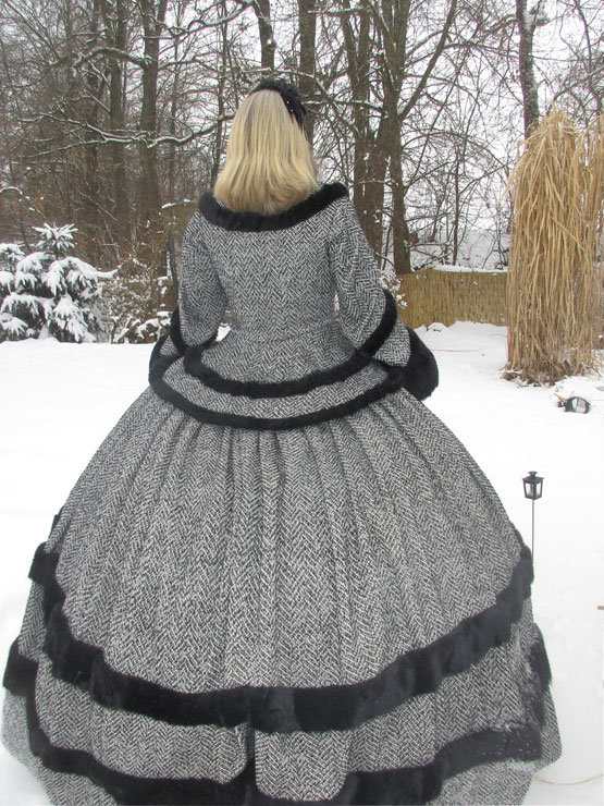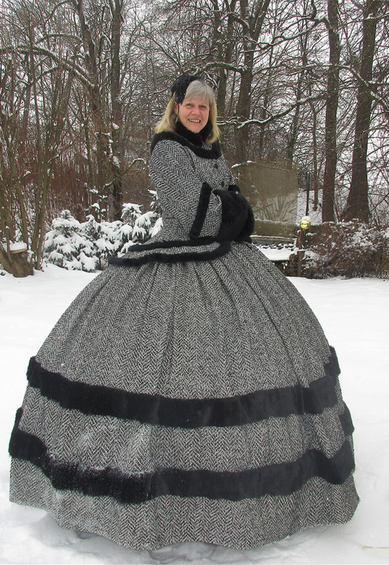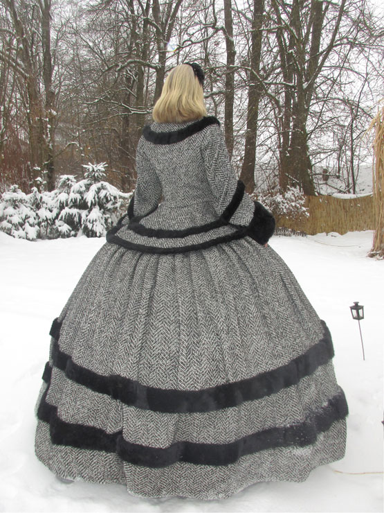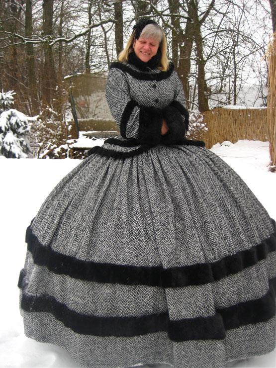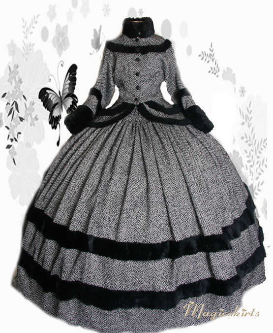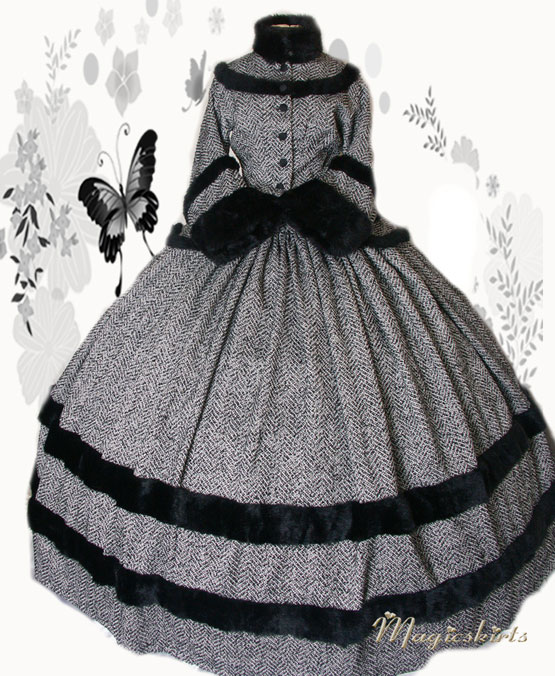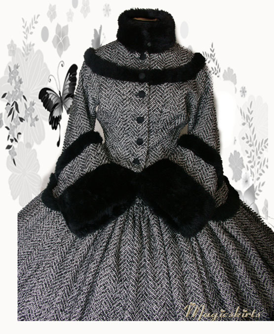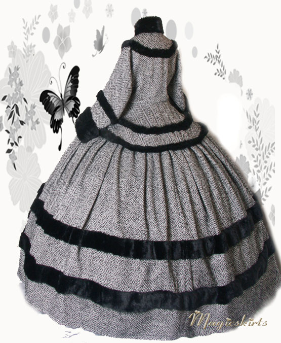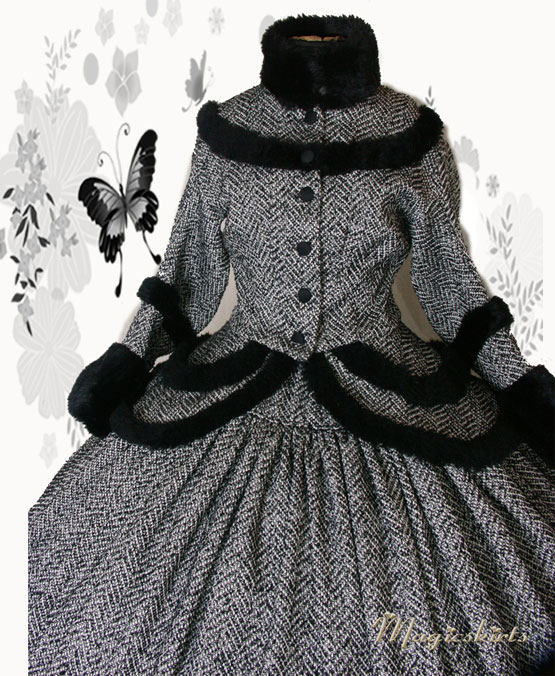 Das Wintertraumkleid hier in einem wunderschönen Tweedstoff, schwarz weiß und mit Fischgrätmuster JackenOberteil mit weiten besonderen Ärmel und Kunstfellabschluß und Verzierungen, nach Wunsch, weiter Ballrock, mit Kunstfell verziert