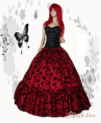 Ballrock "Lissi" in wunderschönem dunkelrotem Taft mit schwarzen Samtrosen beflockt: