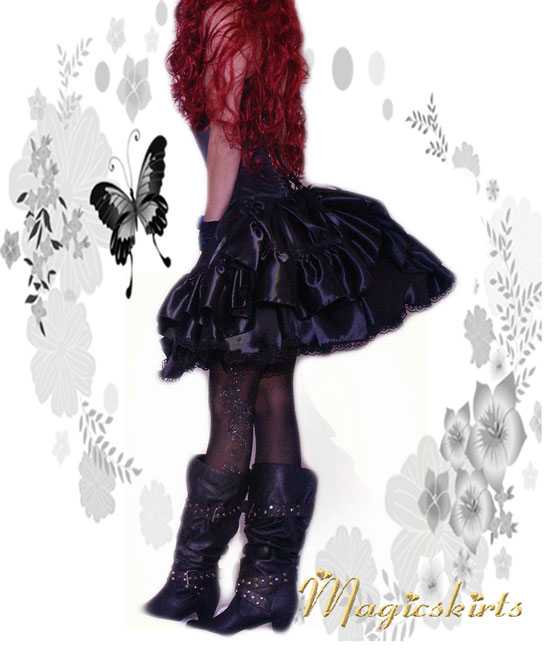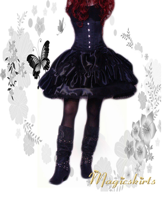 Eine bezaubernde RockKombination in einer kürzeren Länge und tragbar mit vielen Oberteilen. Die Röcke sind so geschnitten, dass sie zauberhaft an jeder Figur wirkt: oben wenig Stoff und unten ein herrlicher Umfang . Der untere Rock (Länge nach Wunsch - bis 65 cm möglich) ist mit schöner schwarzer Spitze verziert, Umfang ca. 500 cm. Der obere Rock ist 6 x gerafft und mit Rüschen, Satinbänder,Spitzenborte und Ansteckblumen geschmückt. Die Röcke sind auch einzeln zu tragen. Flexibel in der Taille durch Gummibund, -durch Umstülpen des dünnen nicht auftragenden Gummizugs können Sie auch die Länge regulieren. Super mit einem MidiReifrock oder auch Petticoat zu Tragen. Jede Farbe möglich (die Spitzenborte weiß oder schwarz).