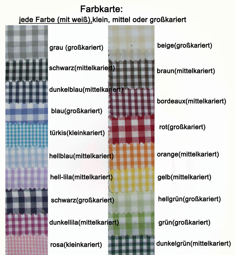 ebenso möglich: ein Beutelchen/Täschchen, ein passendes Cape (wie bei den Röcken: Caro-bunt und RockRosalie)oder Kopfschmuck auch ein VollbrustKorsett mit passenden Ärmelchen (siehe Western-Kollection Isabella) Wester-Rüschenrock "Caro" ist zu haben in folgenden Farben, klein-, mittel- oder großkariert, immer in Kombination mit weiß und auch allen anderen Stoffmuster: Hier klicken zu allen Stoffmustern -extra Fenster
