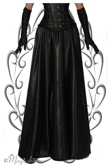 Der Schnitt des Satinrocks ist wie ein Teller, das heißt: oben wenig Stoff und unten ca. 9 m Umfang. Länge ca. 120 cm. In der Taille ein Gummizug (passend zu der Größe/Corsage). Unten ein schöner Saumabschluß, leicht wellig. Der Rock trägt durch den Schnitt nicht auf und fällt super von der Taille über die Hüften - auch ohne Reifrock perfekt zu tragen.
