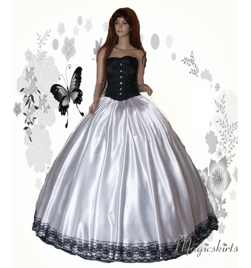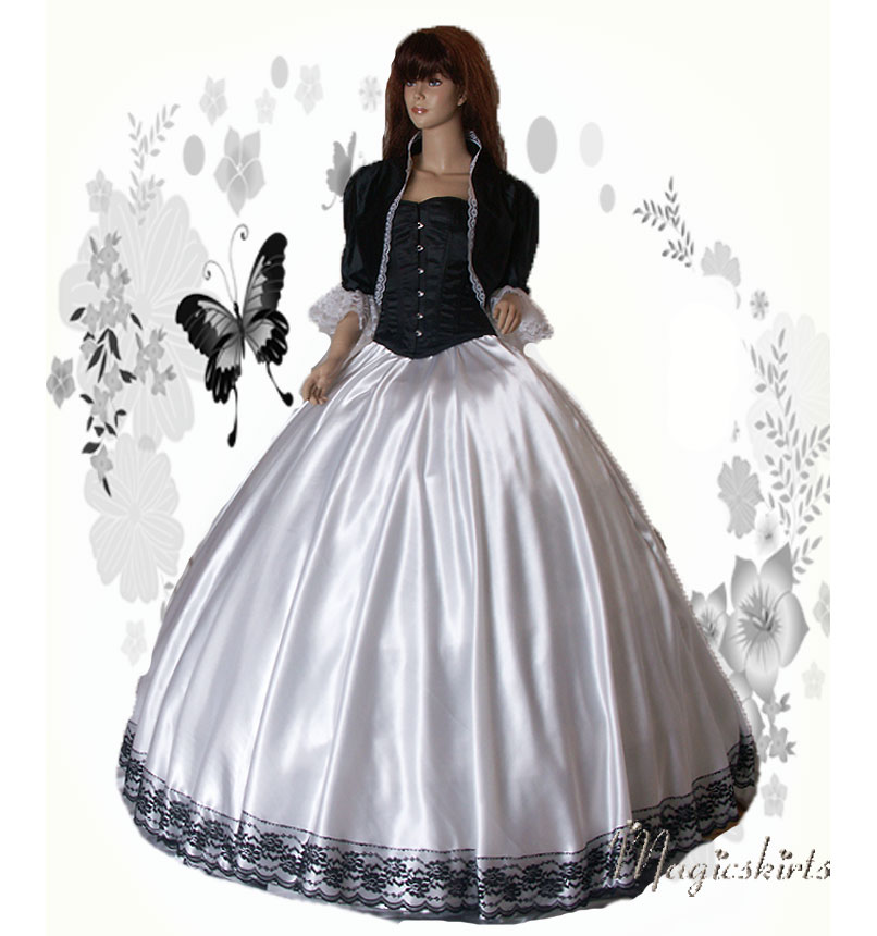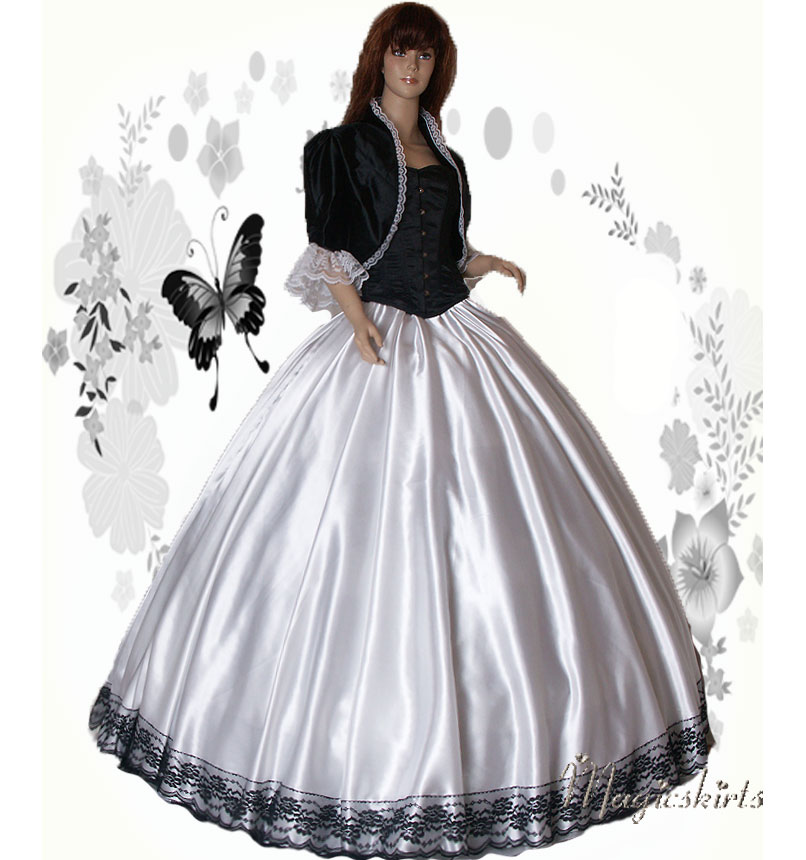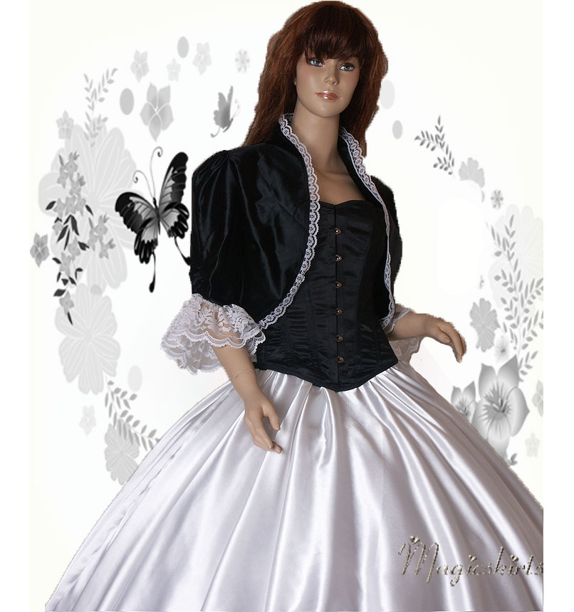 Der Ballrock ist in allen Farben möglich, die Spitzenborten in weiß oder schwarz, das Bolero in schwarz mit weißer oder schwarzer Spitzenborte.