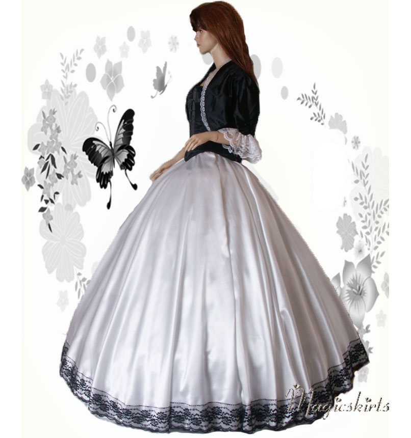 Der Schnitt des Satinrocks ist wie ein Teller, das heißt: oben wenig Stoff und unten schön weit. Länge ca. 120 cm. In der Taille ein Gummizug (passend zu der Größe/Corsage). Unten verziert mit einer schönen breiten Spitzenborte. Der Rock trägt durch den Schnitt nicht auf und fällt super von der Taille über die Hüften - auch ohne Reifrock perfekt zu tragen. Dieser Rock ist in allen Farben möglich. Das Bolero ist aus schwarzem Satin verziert mit Spitzenborten (weiß oder schwarz)