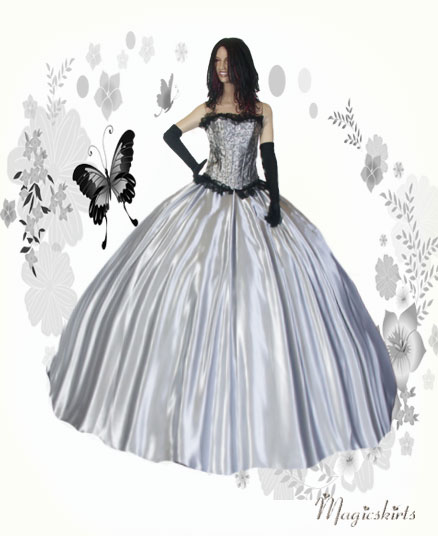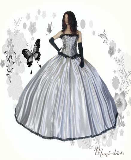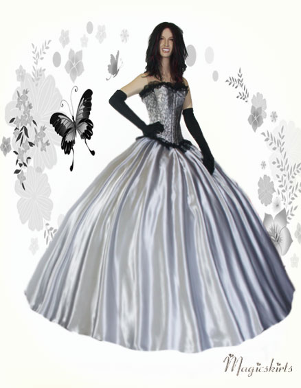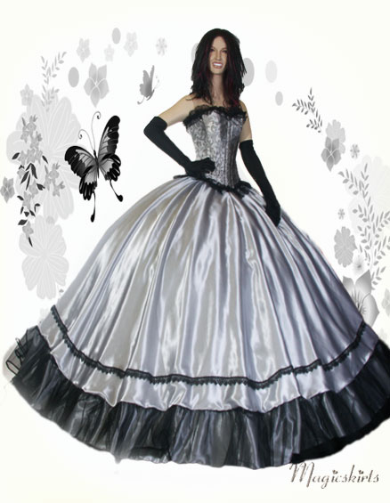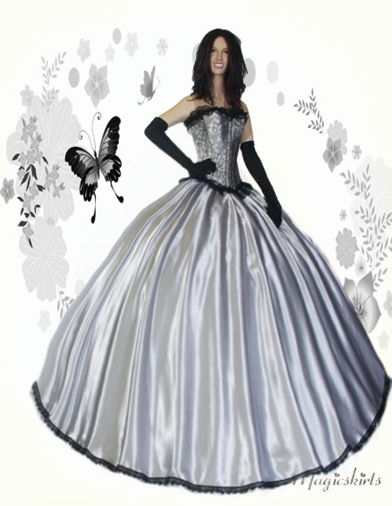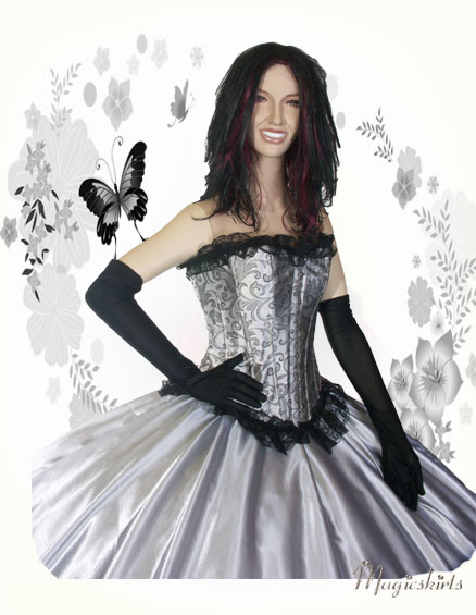 Die bezaubernde Kombination besteht aus: Corsage, Satinrock & und schwarze lange Satinhandschuhe ♥♥♥ Diese Corsage ist aus wunderschönem grauen Bokat mit floralen Muster gefertigt und schließt oben und unten mit einer breiten schwarzen Spitzenbordüre ab. Sie hat vorne einen robusten Ösenverschluß aus Metall und ist hinten zu Schnüren. Man kann die Corsage auch wunderbar als Top zu Röcken oder auch Jeans tragen. Sie hat 12 weiche eingearbeitete Stützstäbchen und ist sehr gut verarbeitet. Farbe: silberschwarz Der Schnitt des Satinrocks ist wie ein Teller, das heißt: oben wenig Stoff und unten ca. 8-9 m Umfang. Länge nach Wunsch, möglich bis ca. 120 cm. Flexibel in der Taille durch Gummibund, -durch Umstülpen des dünnen nicht auftragenden Gummizugs können Sie auch die Länge regulieren. Den Saumabschluß gibt es in 3 Variationen: -normal leicht wellig, ohne Verzierung - verziert mit einer schönen schwarzen Borte - verziert mit Borte und Tüllrüsche