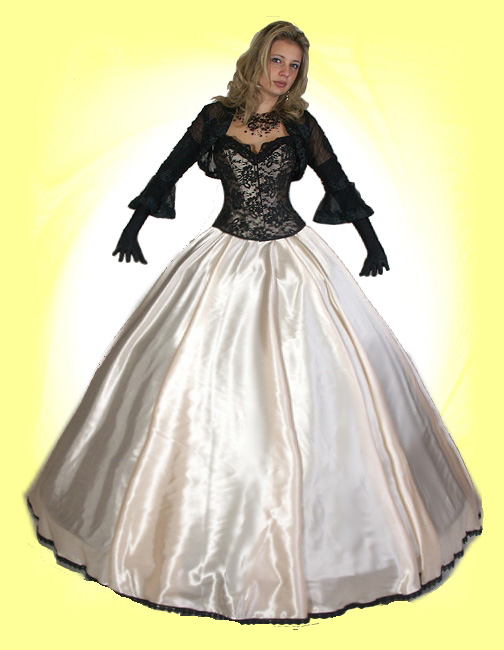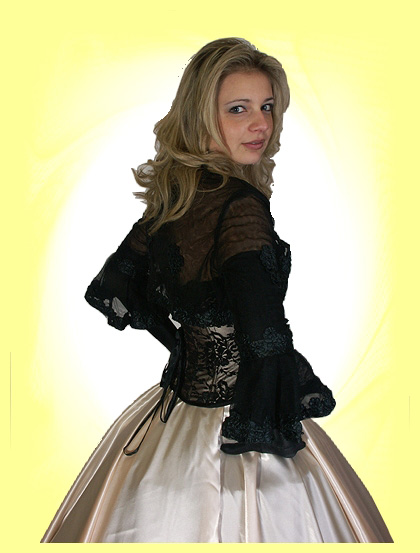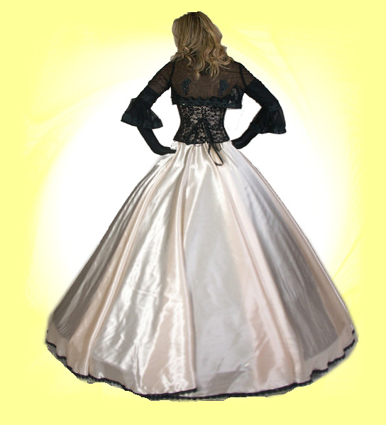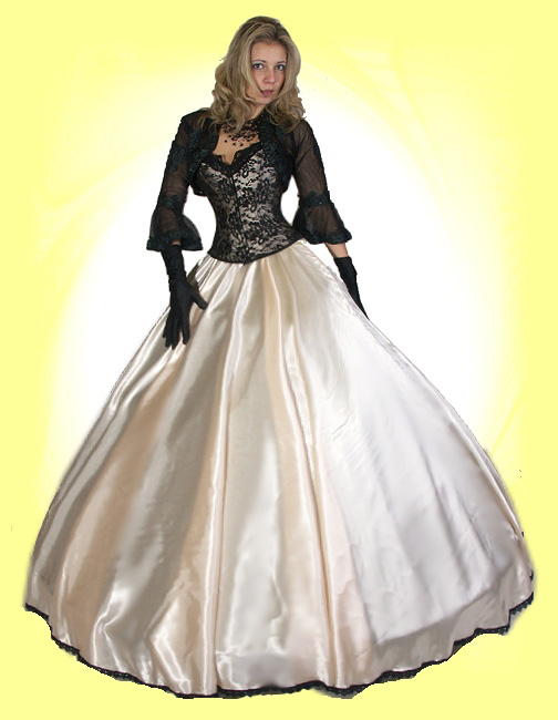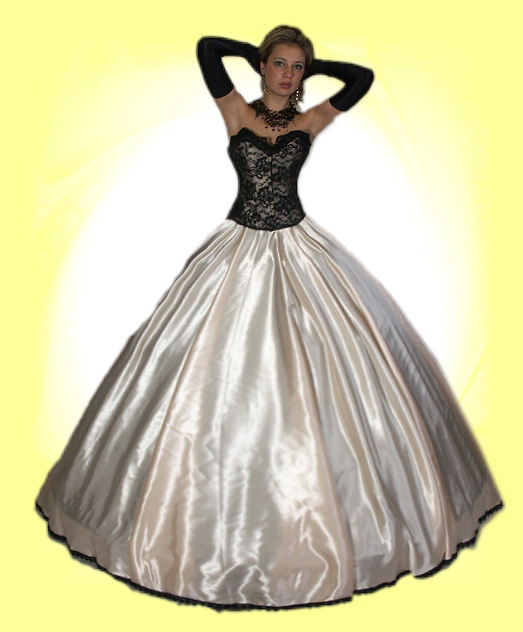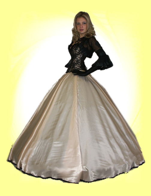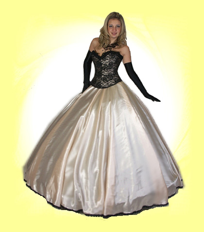 ♥♥♥ BK-champagner, Ballkleid-Kombination ♥♥♥ 4 oder 5 teilig Beschreibung: Corsage, Handschuhe, Ballrock, Bolero, Reifrock: ♥♥♥ Die wunderschöne Satin-Corsage hat eine Lage aus schwarzer Spitze, vorne einen Hakenverschluß und einen Schnürverschluß hinten. Man kann die Corsage auch wunderbar als Top zu Röcken oder auch Jeans tragen. Sie hat 12 eingearbeitete Stützstäbchen aus PVC und ist sehr gut verarbeitet. Farbe: beige-gold-schwarz