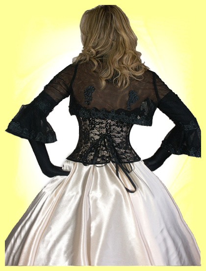 Der schwarze durchsichtige Bolero hat wunderschöne Trompetenärmel und ist mit Ornamenten geschmückt.