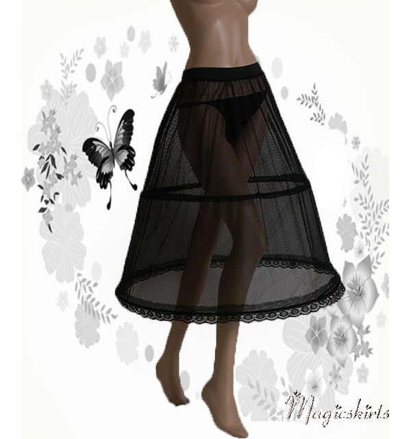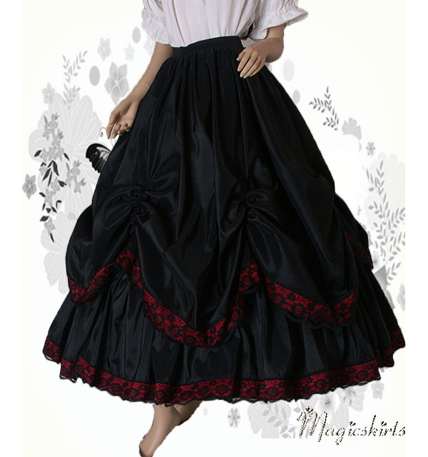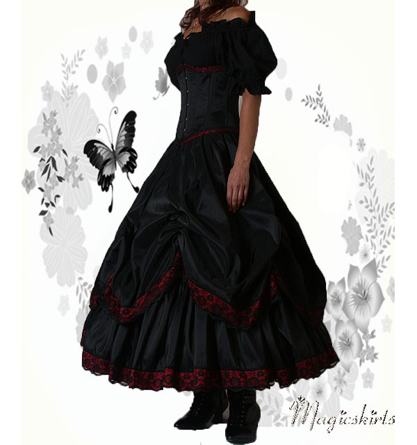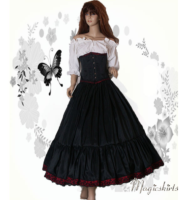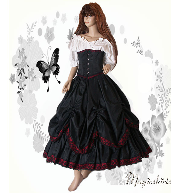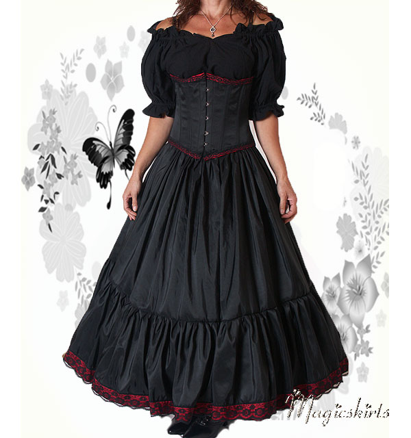 Die RockKombination Ariane ist aus schwarzem Taft mit einer Borte in dunkelrot und schwarzer Spitze darüber. Darunter ein MidiReifrock, somit fällt die RockKombination Ariane wunderschön und bezaubernd.