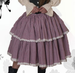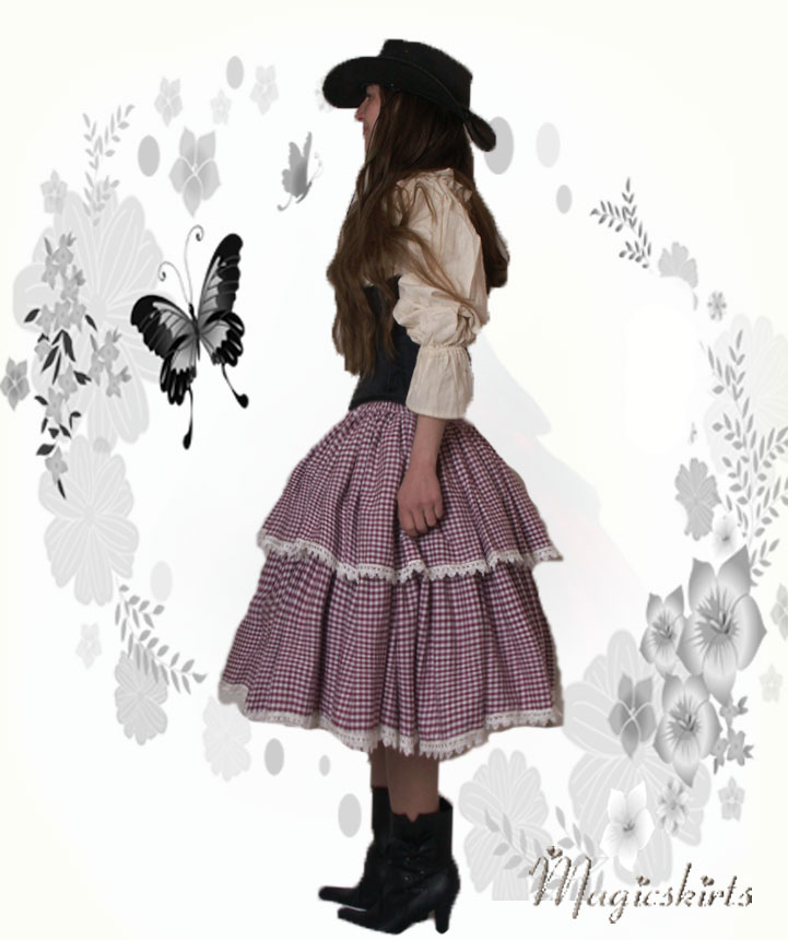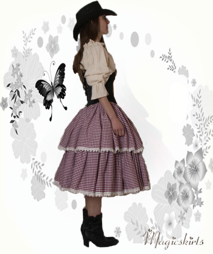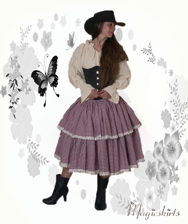 ebenso möglich: ein Beutelchen/Täschchen, ein passendes Cape oder Kopfschmuck auch ein VollbrustKorsett mit passenden Ärmelchen (siehe Western-Kollection Isabella) ♥♥♥ Wester-Rüschenrock "Caro-midi" ist zu haben in folgenden Farben, klein-, mittel- oder großkariert, immer in Kombination mit weiß:
