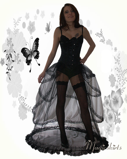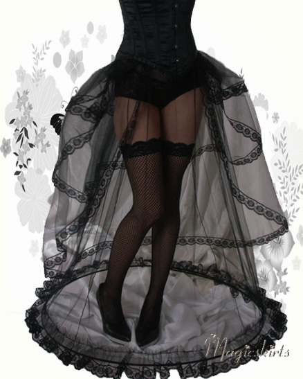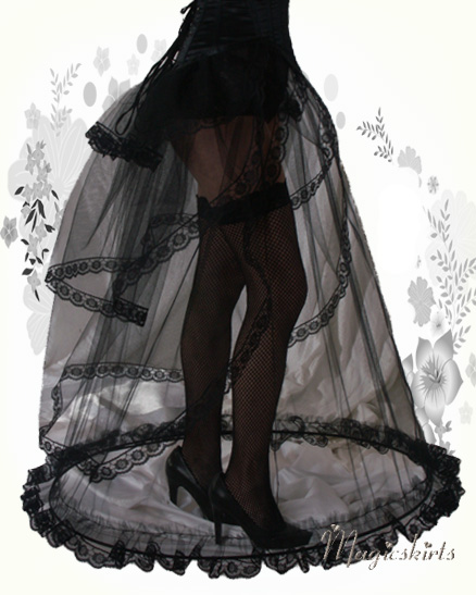Die 3lagige Schleppe ist in der Taille zu binden und ebenso mit schwarzer Spitze verziert. Sie können den Rock auch ohne Reifen tragen. Oder die Teile einzeln, z.B. die Schleppe über einem Ballrock etc. Tüllreifrock ist möglich in allen Farben, die Spitzenborte in schwarz oder weiss.